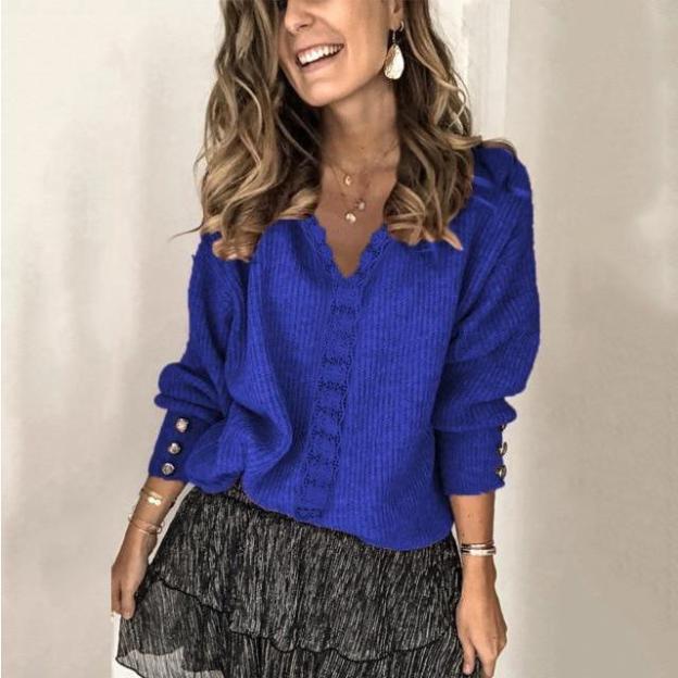 Damen Herbst Elegante Spitze Langarm V-Ausschnitt Freizeitpullover
