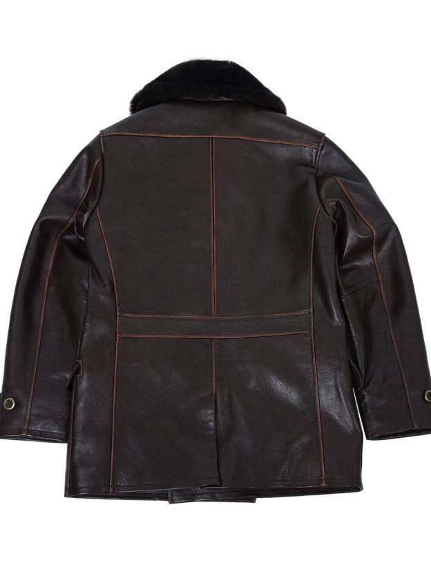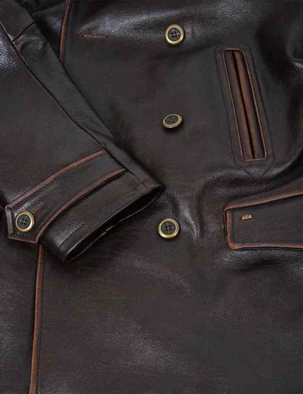 Inspiriert von der Widerstandsfähigkeit der Soldaten, die der eisigen Kälte an der Front trotzen, ist dieser Peacoat ein Zeugnis des unbezwingbaren Geistes derjenigen, die gedient haben. Das dunkelbraune, abgenutzte und patinierte Leder erzählt die Geschichte zahlreicher Einsätze, jede Schramme ist ein Zeugnis des unerschütterlichen Willens seines Trägers.