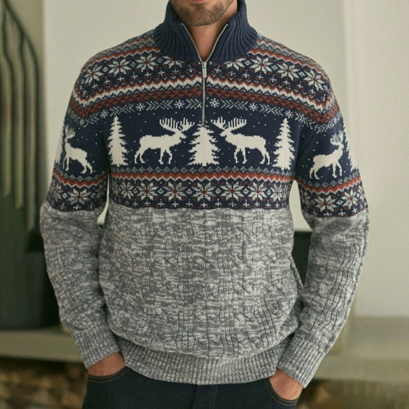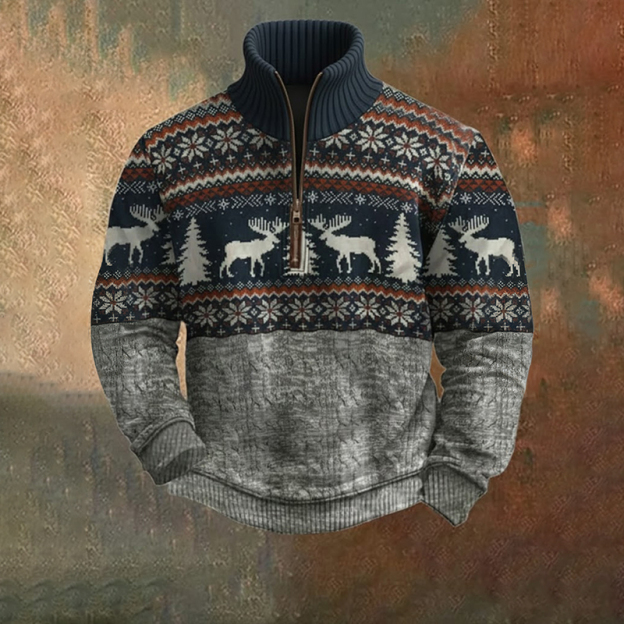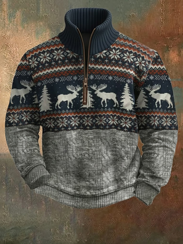 Herren Rentier Regular Fit Weihnachtskunst Halbzip Sweater
