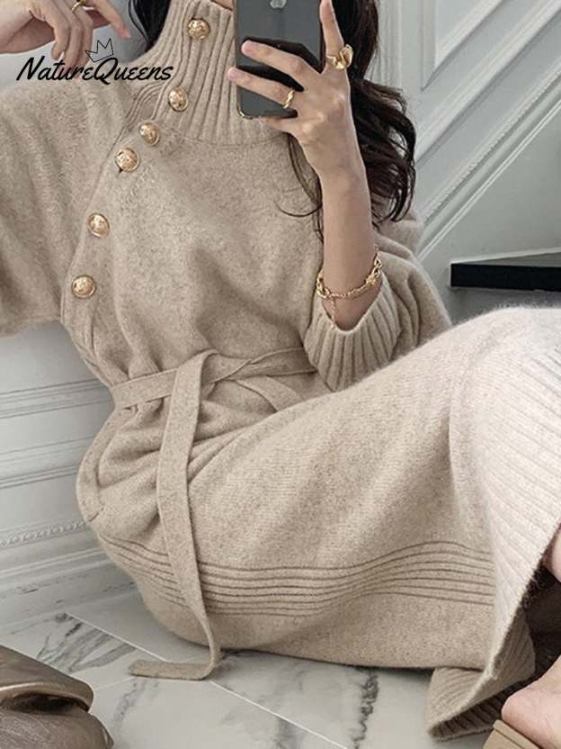 Damen Elegantes Lässiges Rollkragen Lang Strickkleid